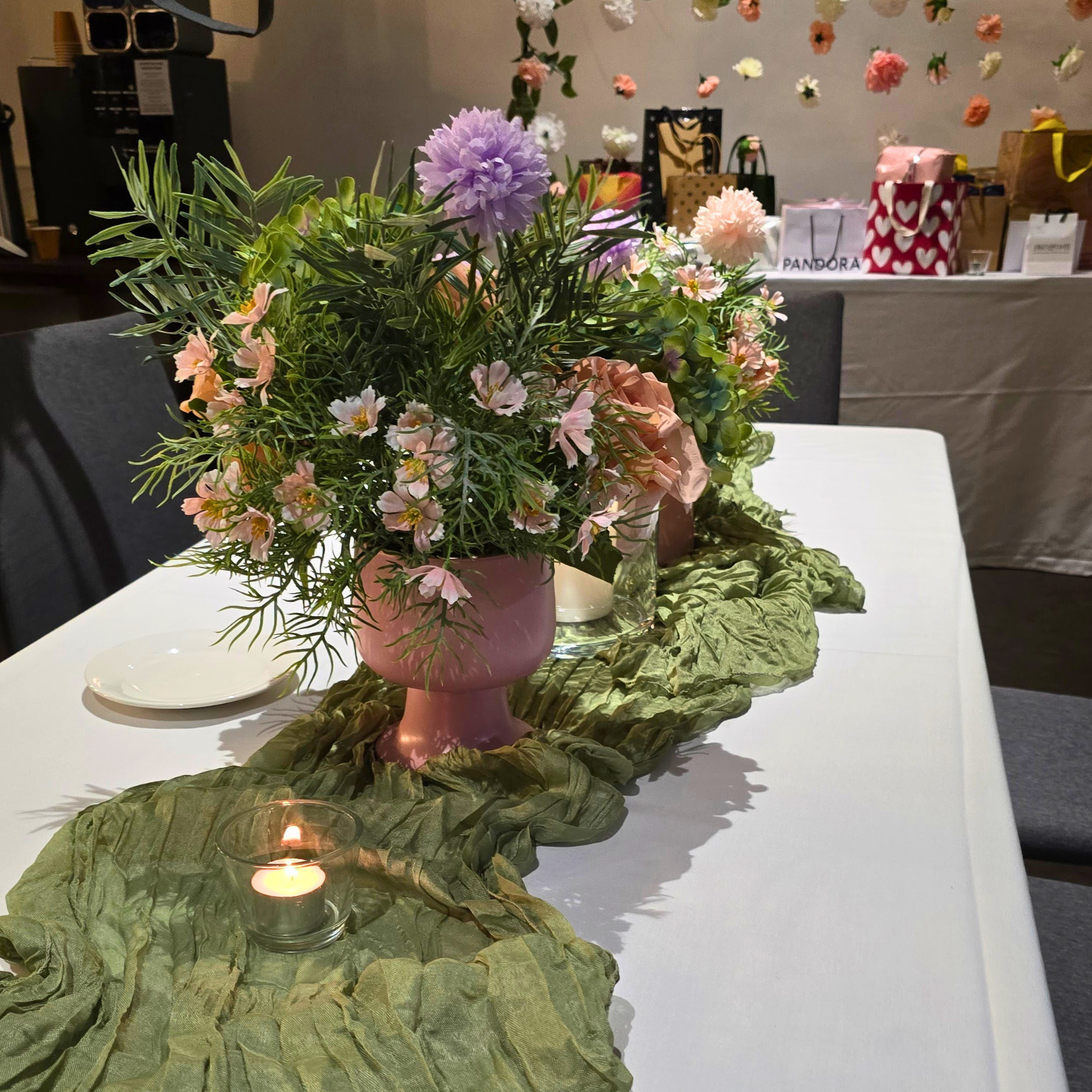 Tables were styled with lush, layered floral arrangements, balancing elegance with a whimsical garden feel. Each arrangement was designed to create a cohesive visual flow across the room while offering intimate touches at every seat. The styling ensured that even moments between activities felt special and thoughtfully designed.