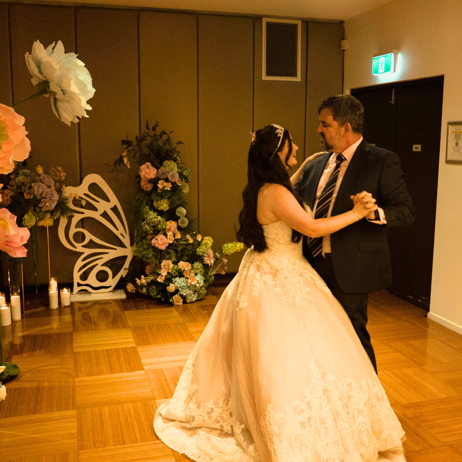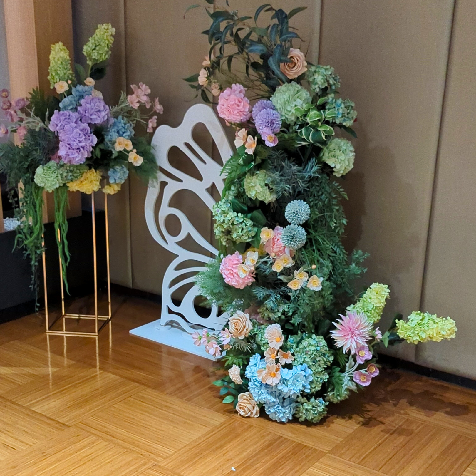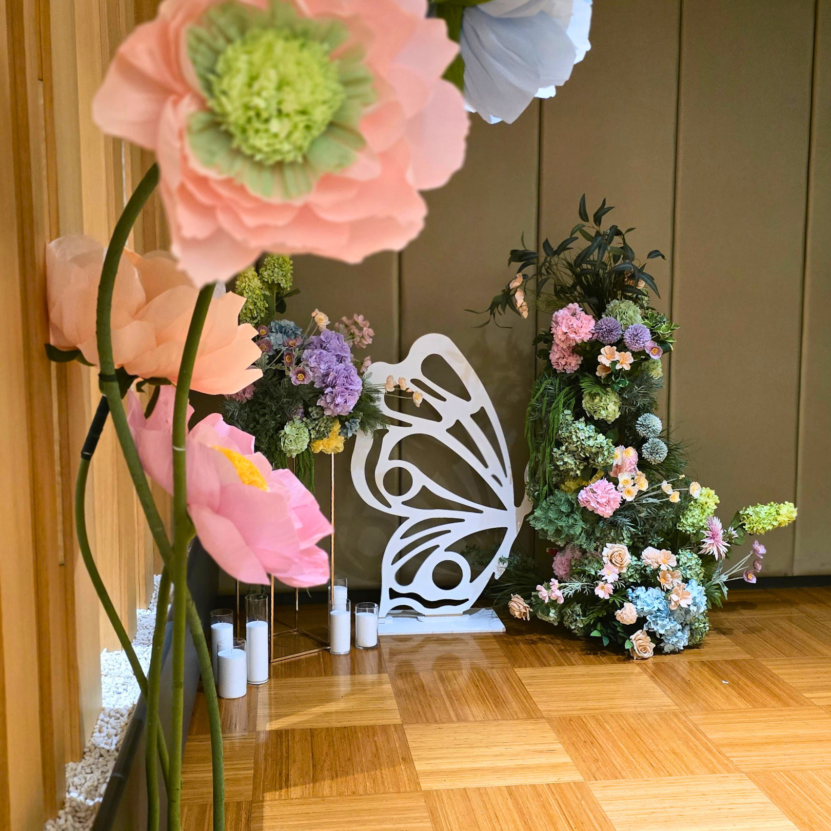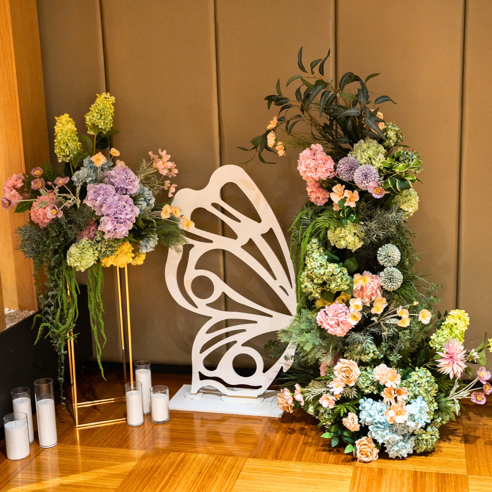 The dance floor was adorned with floral arrangements and delicate butterfly cutouts, adding movement and whimsy to the space. These details created a sense of enchantment and encouraged guests to step onto the floor and engage with the celebration. The decor complemented the theme while maintaining a sophisticated, immersive experience.