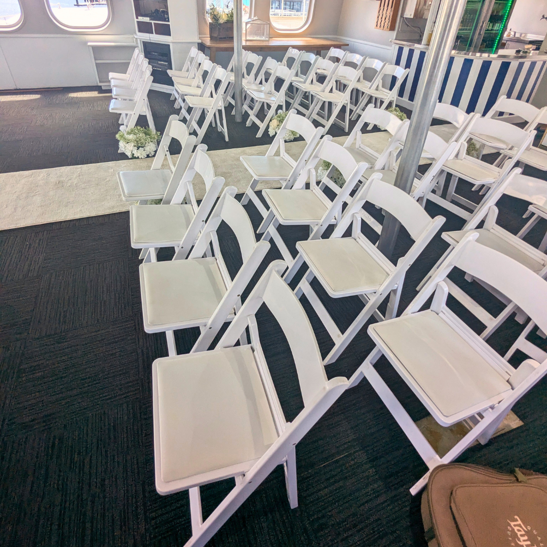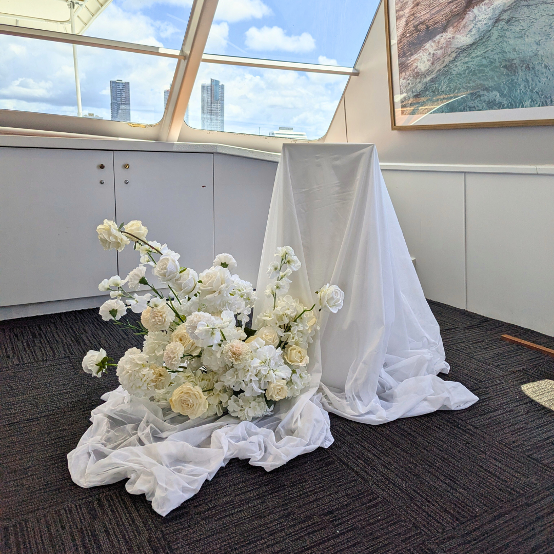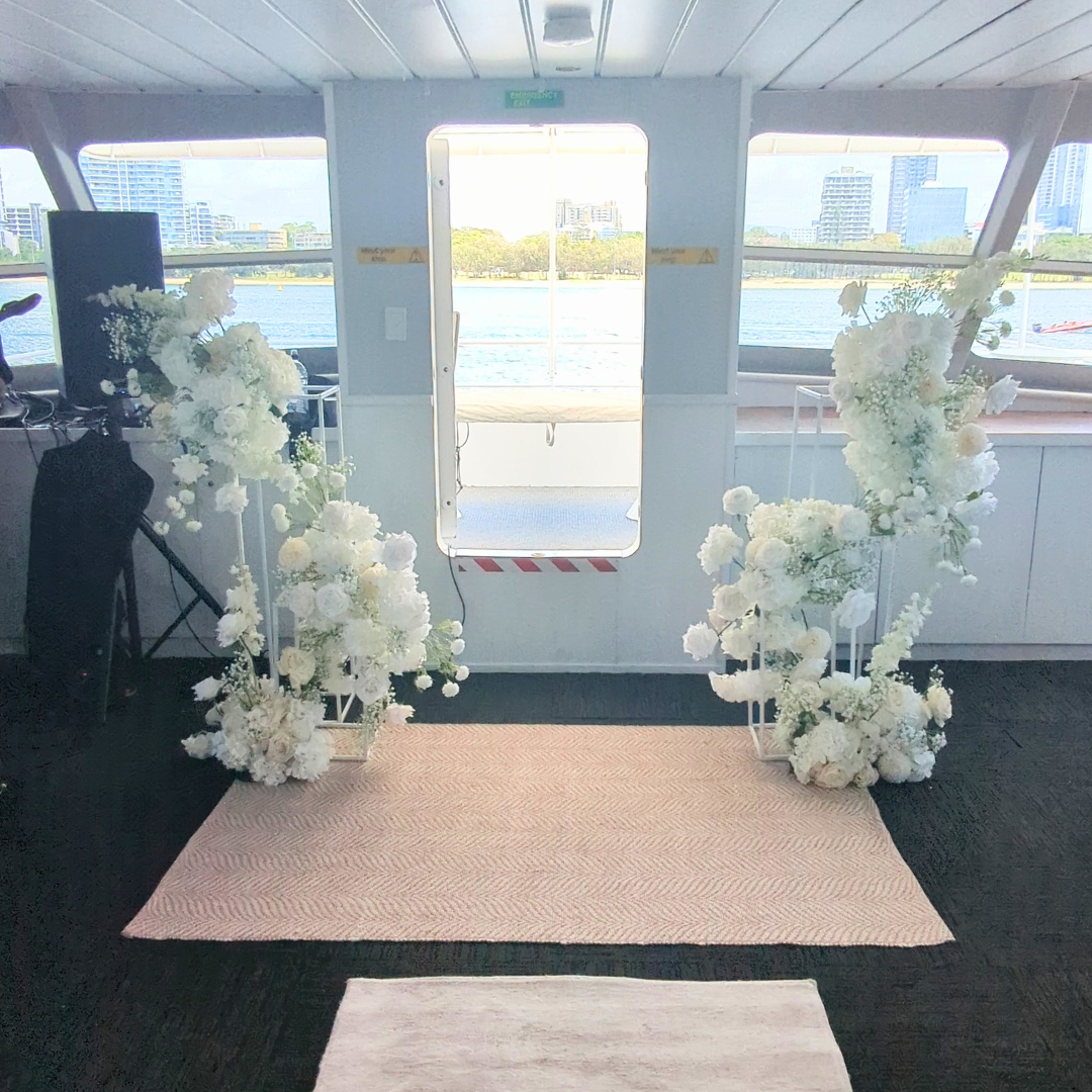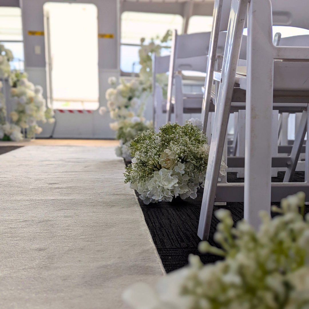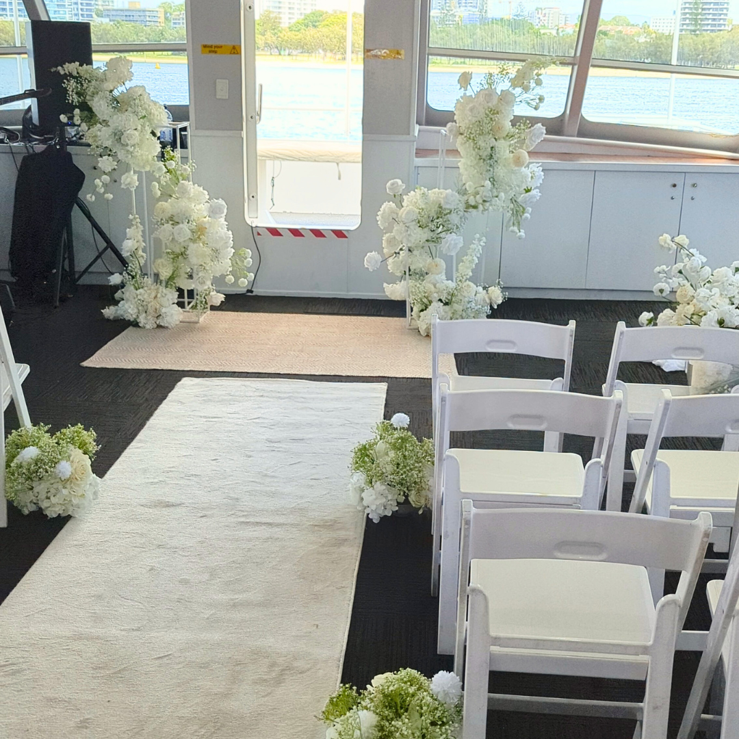 The ceremony was styled with a classic white floral theme, creating a timeless and elegant atmosphere on the yacht. A white aisle runner led to a beautifully adorned altar, framed by delicate floral arrangements and lush greenery. Americano chairs were carefully placed to enhance the sophisticated setting, ensuring a picture-perfect moment as Fabian & Leanne exchanged their vows.