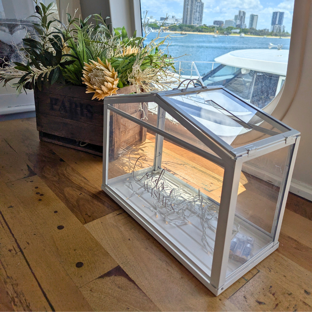 The reception styling continued the classic white floral theme, with elegant décor that complemented the yacht’s luxurious setting. The cake-cutting area was beautifully arranged with soft florals and refined details, creating a romantic focal point for this special moment. A stylish wishing well was placed for guests to leave their well wishes, seamlessly blending into the sophisticated design of the celebration.