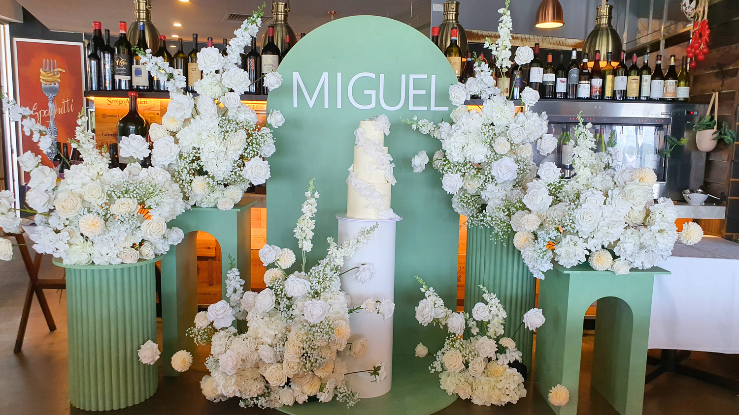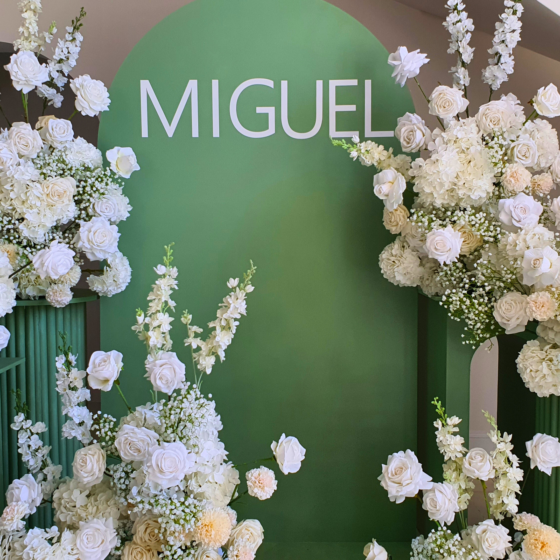 The backdrop featured multiple arches and plinths, all painted in a soft sage green and adorned with white florals, creating a fresh and sophisticated aesthetic. The layered design added depth and dimension, making it a striking focal point for photographs and guest experiences. This single styling element transformed the space into a serene, elegant setting perfect for a christening.