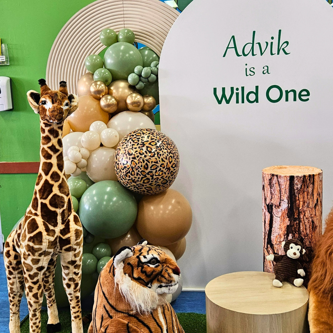 Elevate your child’s celebration with our Safari Themed Balloon Backdrop, designed for those who appreciate luxury and bespoke event styling. This exquisite setup features a large arch, a medium arch, and a rainbow arch, all adorned with our signature organic luxe balloon garland in earthy tones, complemented by three elegant plinths and four safari animal figures. Perfect for creating a chic "Wild One" party, this high-end backdrop adds a bespoke touch with personalised signage, ensuring your event in Brisbane, the Gold Coast, and beyond leaves a lasting impression.